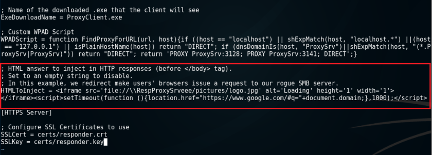 The parameter HTMLToInject contains the value which will be reflected and executed in the web application created by Responder. This is our point of injection in which we will add our custom JavaScript and HTML code.