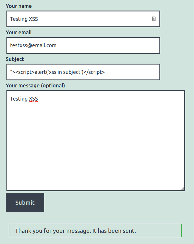 Secondly, I injected a Cross-Site-Scripting payload in the Form’s Subject, as the following screenshot shows: