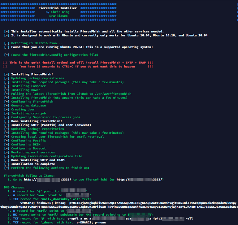 - FiercePhish was picked as it’s easy to deploy and automates installation of Postfix, SMTP and generates the DNS records (the DNS records are not needed in this case as Mailgun is going to be used).