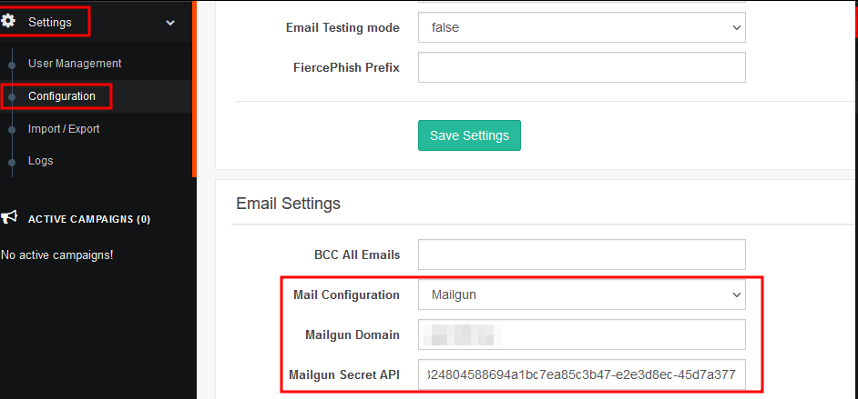 An extra option needs to be set so we can start sending emails. First, login into Fierce Phish and go to Settings → Configuration and choose Mailgun instead of SMTP in the Email Settings field and fill in the information required (you can grab the API key from Mailgun by going to Dashboard → Choose your domain → click on API and then choose an option from there. You should then see the API Key.). Don’t forget to save the settings.