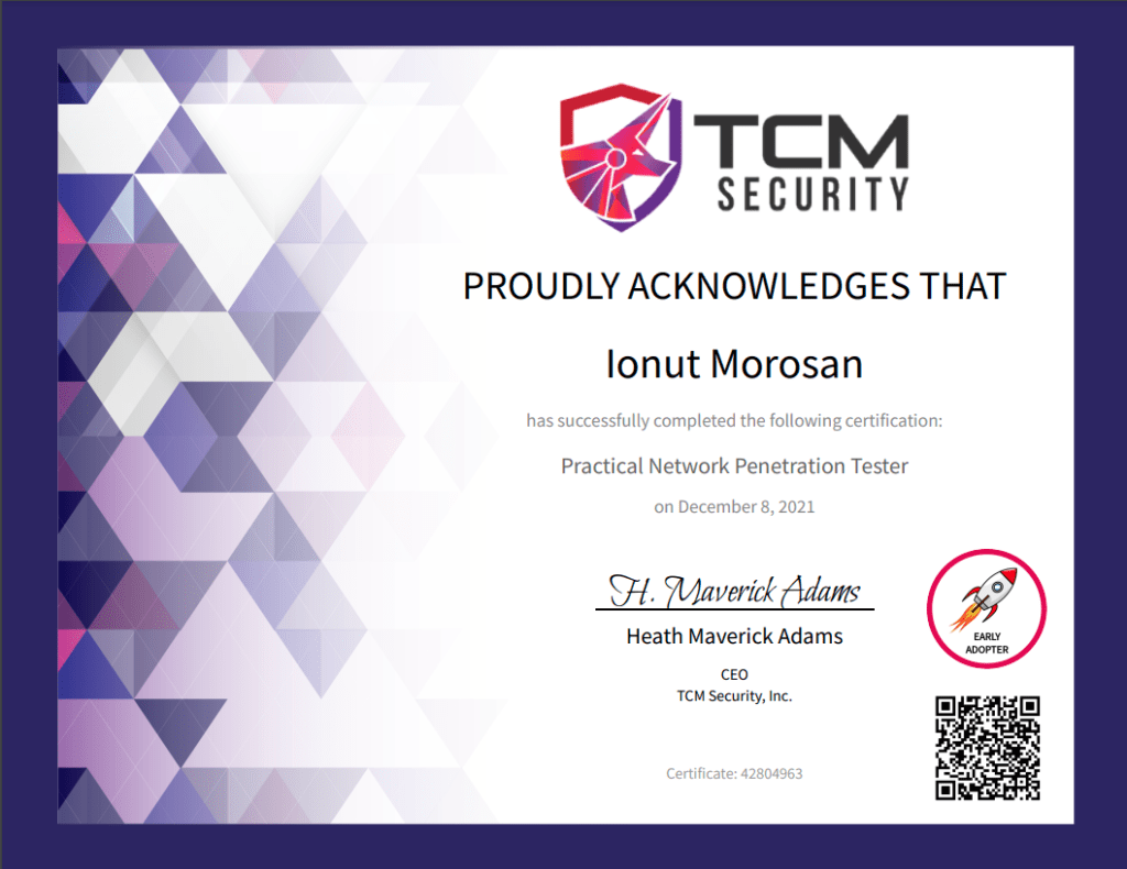 The last step involves the client Debrief in which you are presenting the client with the discovered issues in not-so-technical language. The Debrief took almost 15 minutes, and I prepared a short presentation with the main findings and how I was able to exploit the Active Directory. It started with a quick identification check. When the checking process was complete, I start explaining everything I did in their environment. I was a little bit nervous at first, but Heath was so cool, and everything went smoothly after that. At the end of the debrief, I got my award, which is the actual certification with the Early Adopter (first 100 students that took this certification) badge.