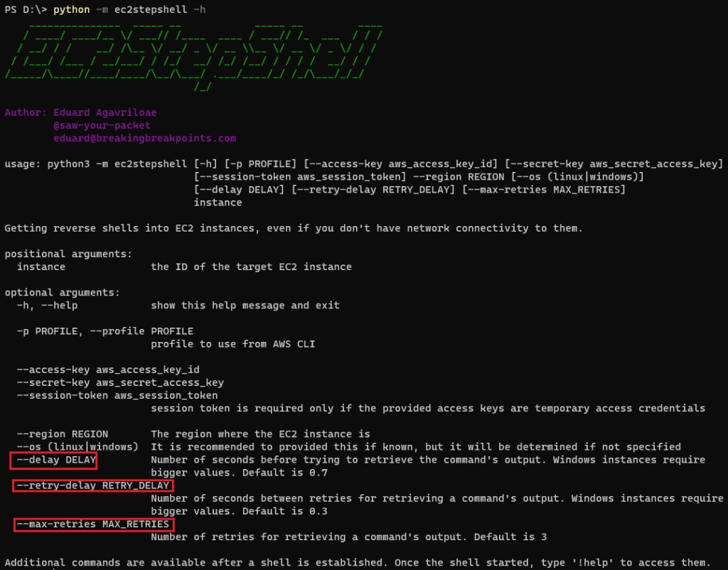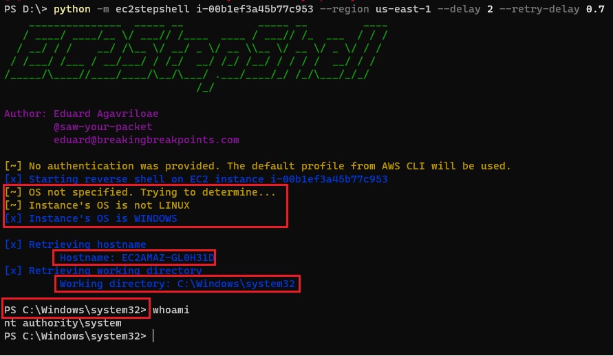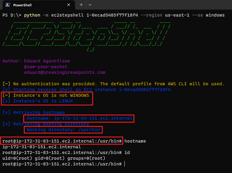 What if you don’t know if you meet the requirements? Well, if you have the instance’s ID and you know the region, just run the tool and see if you get a shell. Worst case scenario, you’ll get an Access Denied error, but best case scenario you get a high privileges reverse shell.