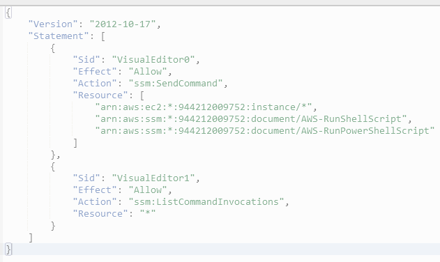 The action ssm:SendCommand must be granted over the target EC2 instance and the documents: