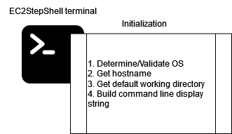 Before starting the shell, there is an initialization process. In this phase, the running OS on the instance, the host’s name and the current working directory are determined. With this information the command input line is constructed so that it would like like a SSH connection.