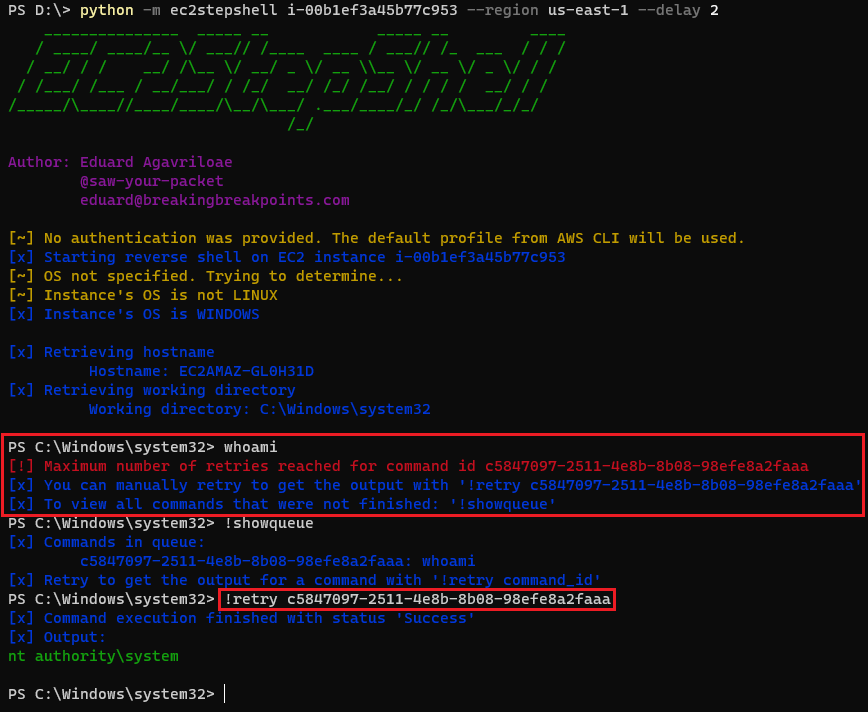 What happens if the command’s output is not retrieved after all the retries? The command ID returned after sending the command is put in a local queue. You can see the queue by typing the command !showqueue. This is a custom command that will be processed by the tool. To view all the custom commands run !help.