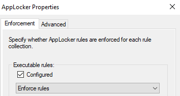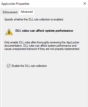 The AppLocker configuration can be further tweaked to restrict the usage of DLLs by enabling DLL rule collection from within the AppLocker properties.