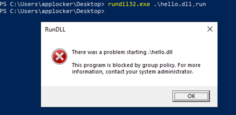 From the initial setup there was no option of blocking out DLLs, resulting in another way of bypassing the application whitelisting. It should be noted that the DLL is located on the user desktop, where a rule enforcing the block of binaries exists.