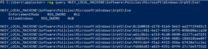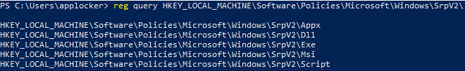 AppLocker policies can be enumerated using the registry query functionality, as show below:
