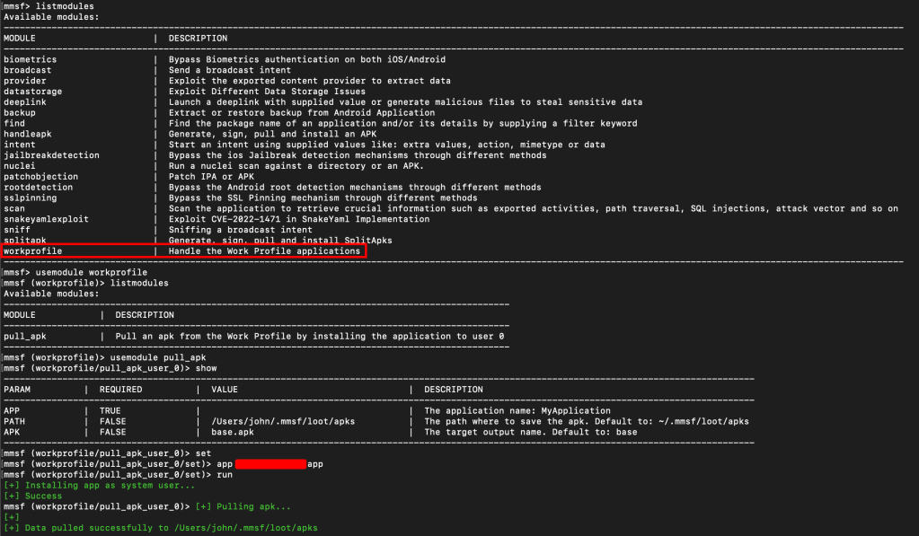 MMSF’s Work Profile module automates this process, making it more efficient and reliable for penetration testers to pull the APK from the device.